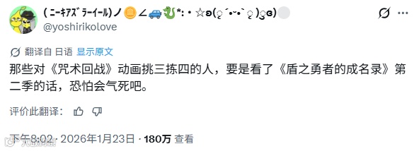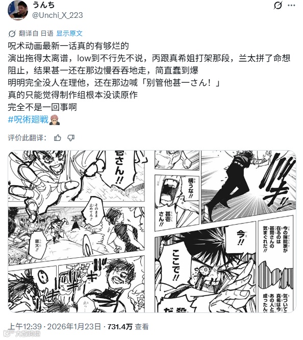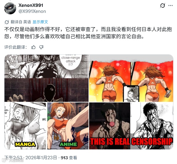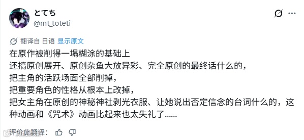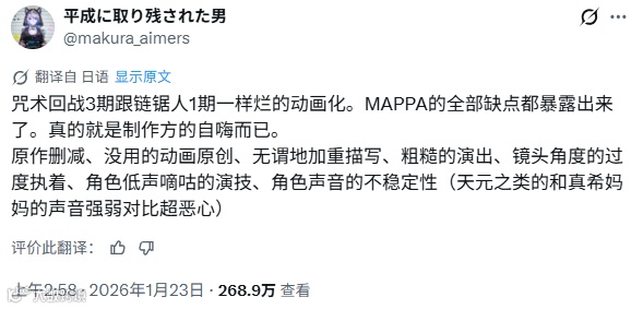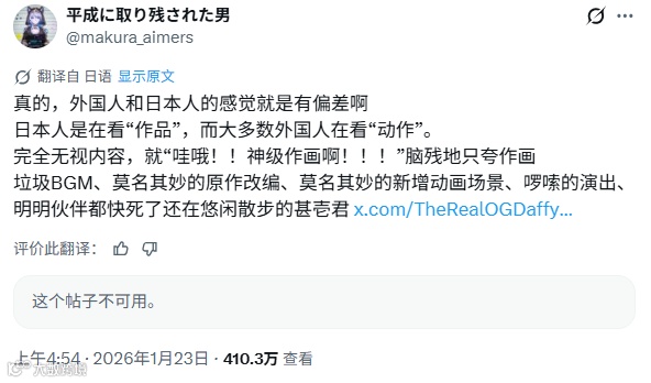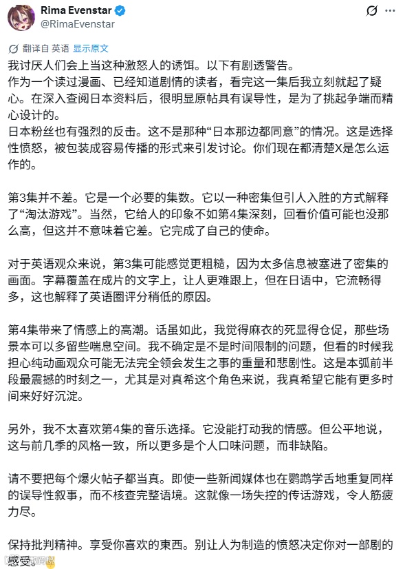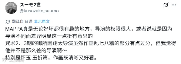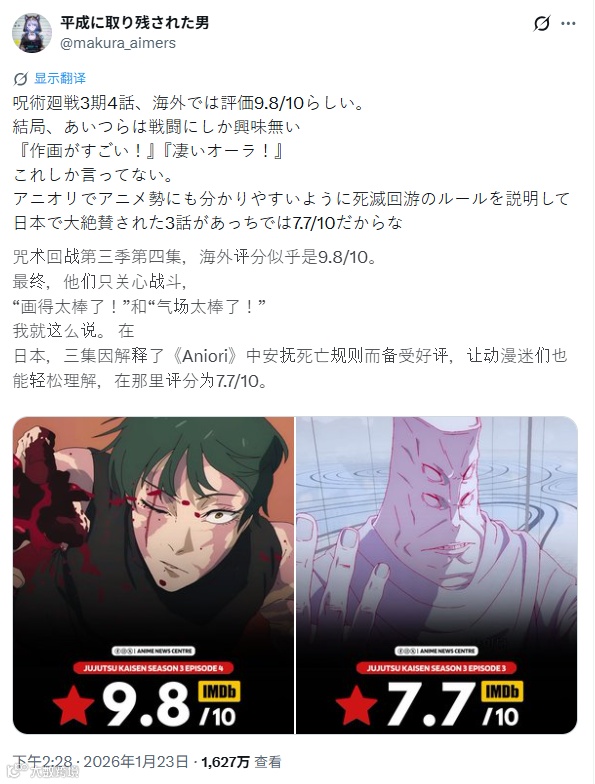 他发帖说:欧美粉丝只关心打戏,才给第四集打9.8;而第三集里MAPPA详细解说死灭回游规则,这种细心操作在日本备受好评,在欧美却只有7.7分。