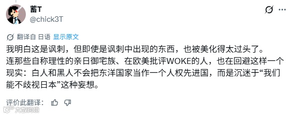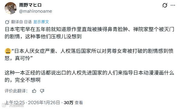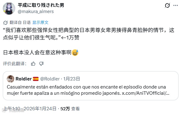 一些英语地区的观众嘲讽日本仍是封建男权社会,打低分是因为“真希杀穿男权家族让某些人破防”。