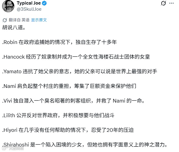 但随后也被海贼王粉丝反驳,称《海贼王》里的女性角色同样有着坚定的意志力和强大的实力。