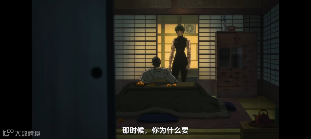 而动画里,甚尔路过的镜头被改成了侧面平视,还被添加了王家卫常用的抽帧效果。