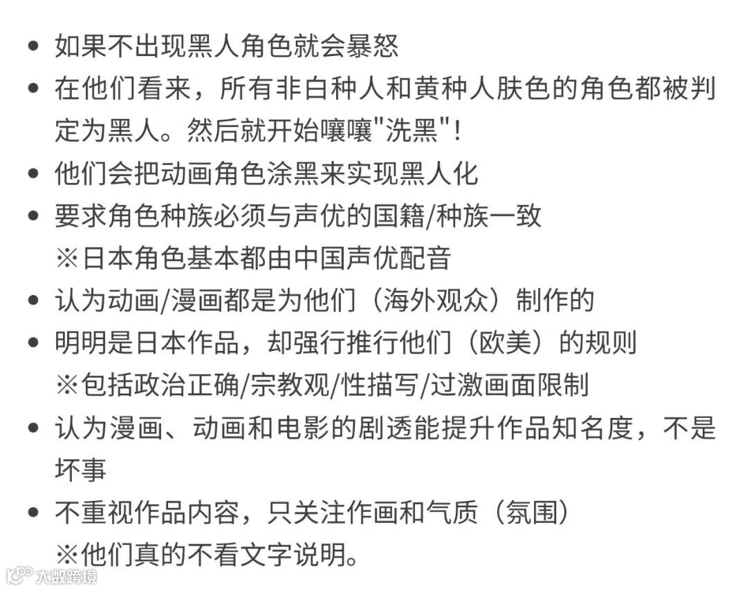 比如外网总有人把日漫角色P成黑人,要求声优种族必须和角色一致,用欧美视角批判日本作品等等。