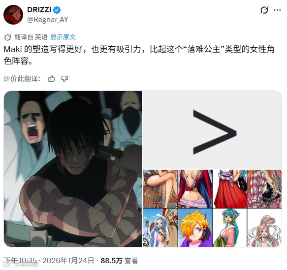 还有人用《咒术》拉踩《海贼王》,说真希这种强大女性的人设比“英雄救美”更符合现代价值观。
