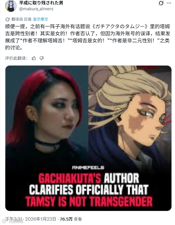 其中一个叫塔姆吉的角色明明是女性,但因为海外翻译失误,在一段时间里被欧美读者当作“非二元性别者”。后来漫画作者明明辟谣了,但仍然有人以“作者根本不懂塔姆吉”为由拒绝相信,最后连作者都被传成了非二元性别者。