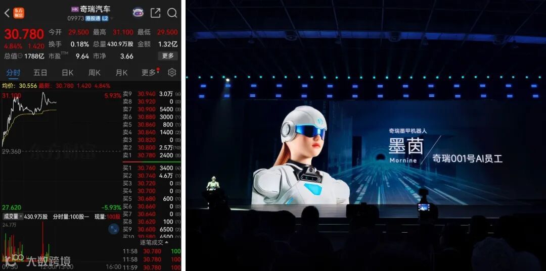 1月19日上午,奇瑞汽车涨幅一度逼近6%。截至今天下午收盘时,奇瑞汽车港股涨幅达4.5%,总市值为1782.08亿。