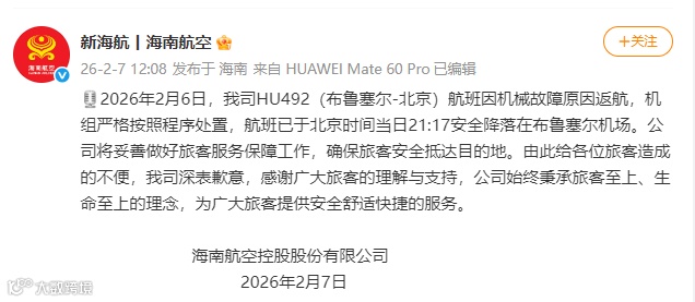 2月7日12时许,海南航空微博发布通报。通报称2026年2月6日,海南航空HU492(布鲁塞尔-北京)航班因机械故障原因返航,机组严格按照程序处置,航班已于北京时间2月7日21时17分安全降落在布鲁塞尔机场。