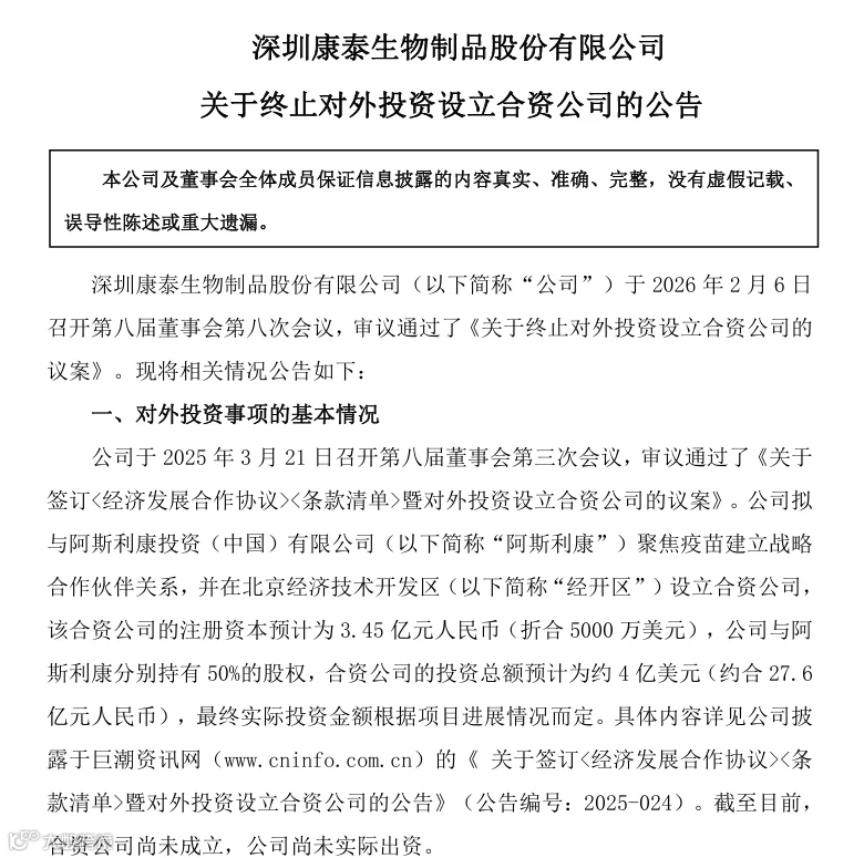 据悉,康泰生物与阿斯利康的合作计划始于2025年3月,彼时公司董事会审议通过相关议案,双方拟在北京经济技术开发区设立合资公司,聚焦疫苗业务建立战略合作关系。合资公司注册资本预计3.45亿元(折合5000万美元),双方各持股50%,投资总额约4亿美元(约合27.6亿元人民币),最终投资金额将根据项目进展调整。截至本次公告披露,该合资公司尚未成立,康泰生物也未实际出资。