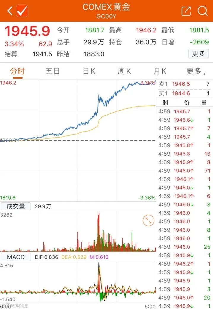 截至收盘,COMEX黄金向上冲破1900美元/盎司关口,单日每盎司暴拉60美元,涨幅达3.34%,报1945.9美元/盎司;COMEX白银上逼23美元/盎司,收报22.895美元/盎司,日内涨幅为4.26%。