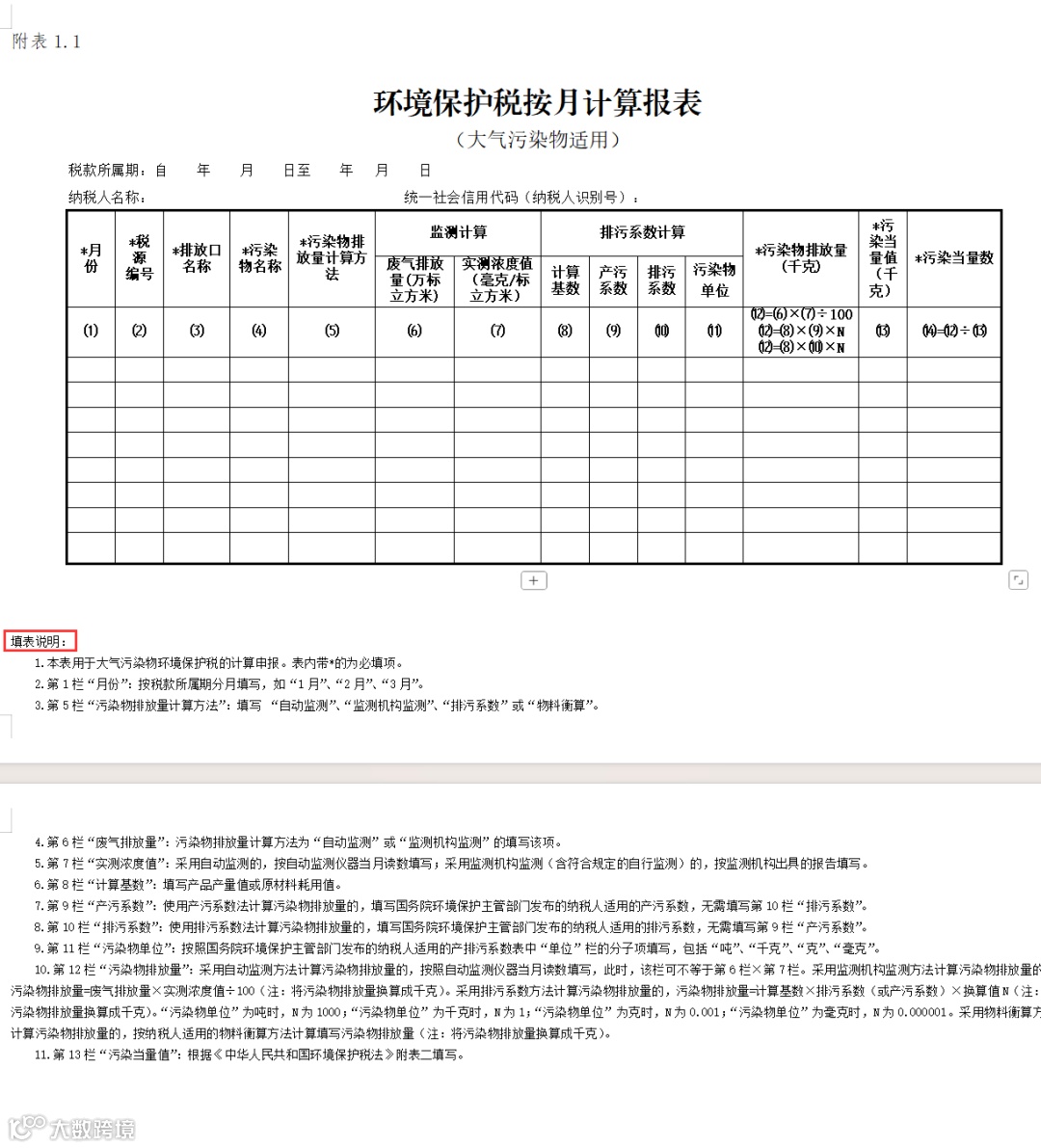 环境保护税按月计算报表及填写说明(大气污染物适用)