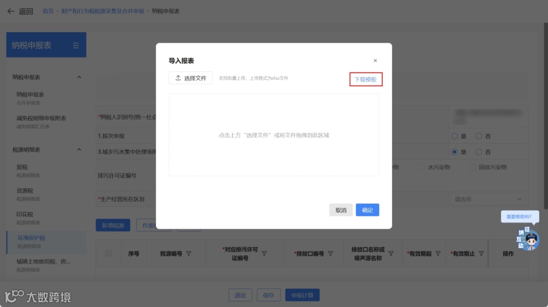 - 点击【下载模板】,获取《环境保护税税源采集模板》,填写相关信息。