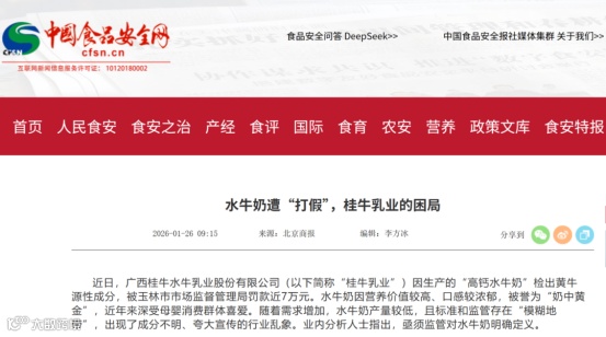 近日,广西知名乳企桂牛水牛乳业因产品检出黄牛源性成分被罚近7万元的消息,再次将水牛奶行业的标准模糊与监管难题推上风口浪尖。