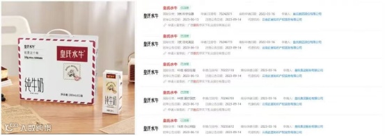 除了含量成谜,商家还会玩文字游戏“障眼法”,愈发让消费者如雾里看花。一些商家将“水牛”注册为商标,在产品包装行大肆宣传,例如皇氏乳业销售的“皇氏水牛纯牛奶”,其中“皇氏水牛”仅是注册商标,产品其实是纯牛奶;皇氏乳业淘宝在售的“一只水牛纯牛奶”也是同样的情况,“一只水牛”也是注册商标。