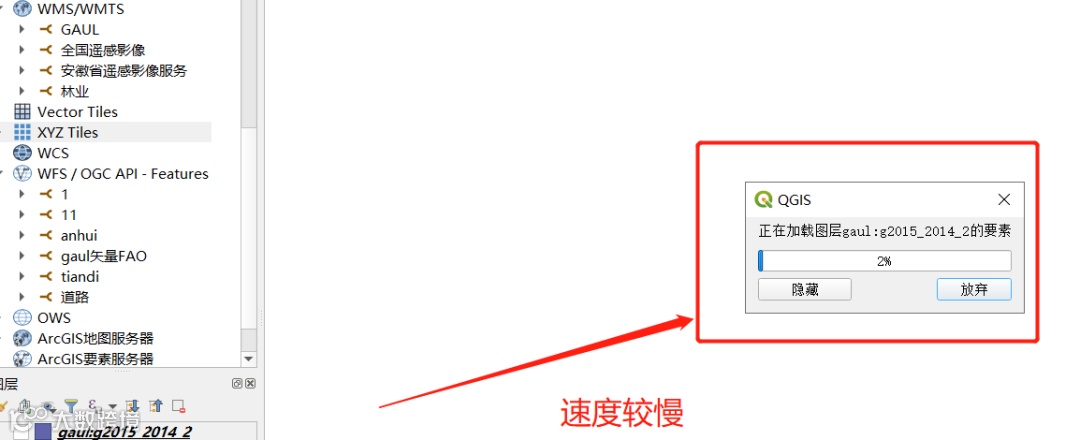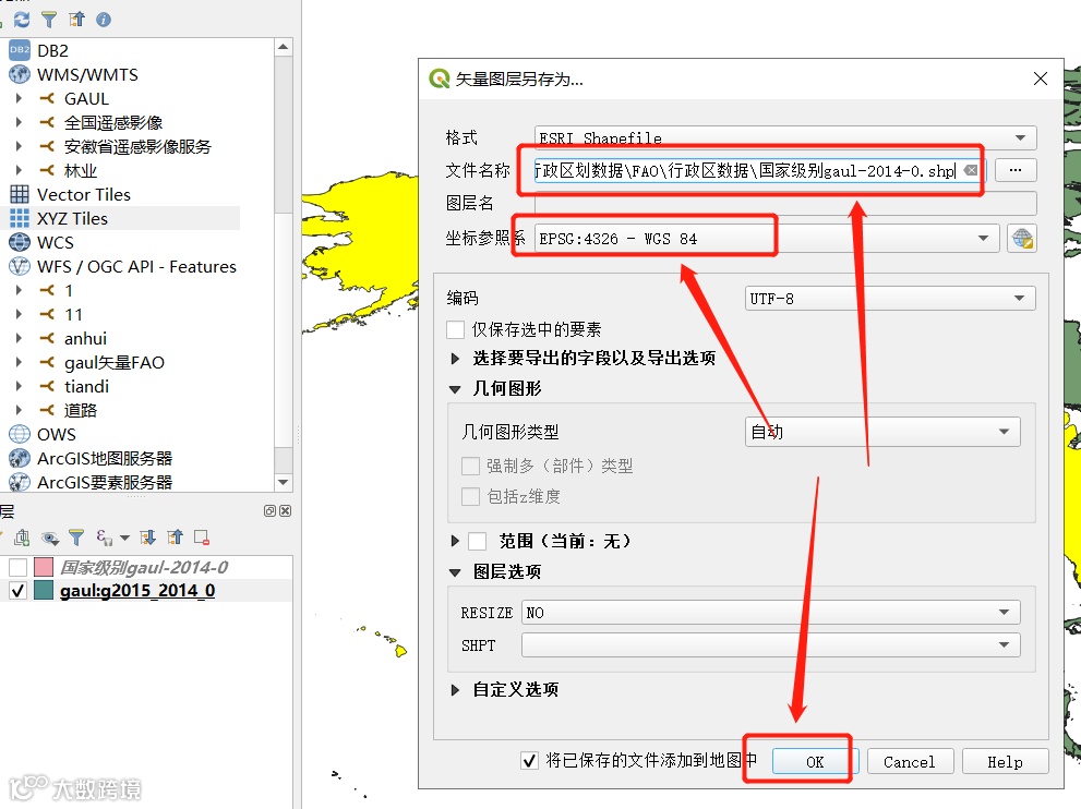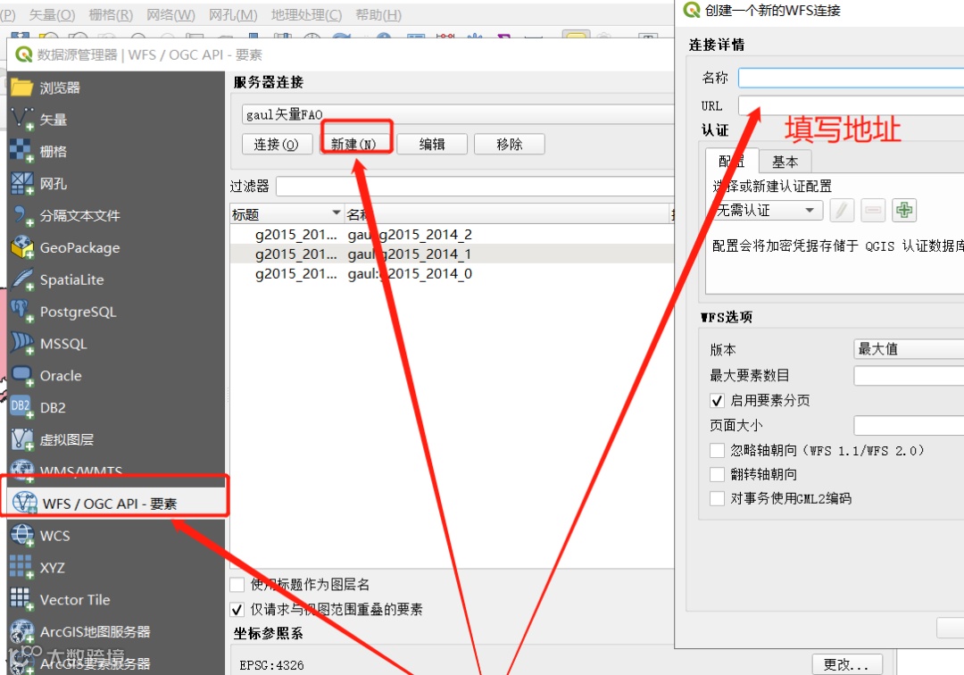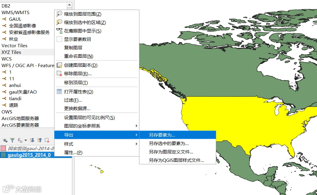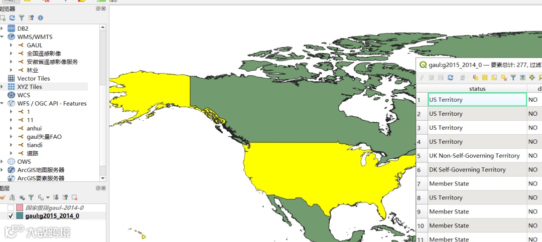 使用QGIS连接WFS服务(地址:https://data.apps.fao.org/map/gsrv/gsrv1/gaul/wfs?version=1.1.0&typeName=gaul:g2015_2014_1&srsName=EPSG%3A4326&maxFeatures=100000),可获取矢量数据并查看属性表。