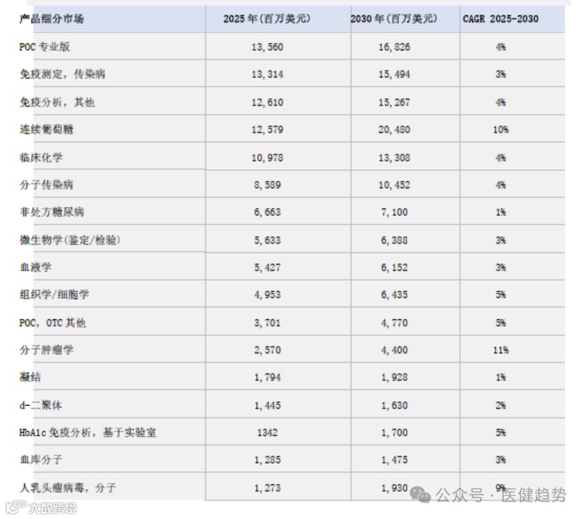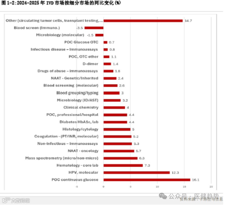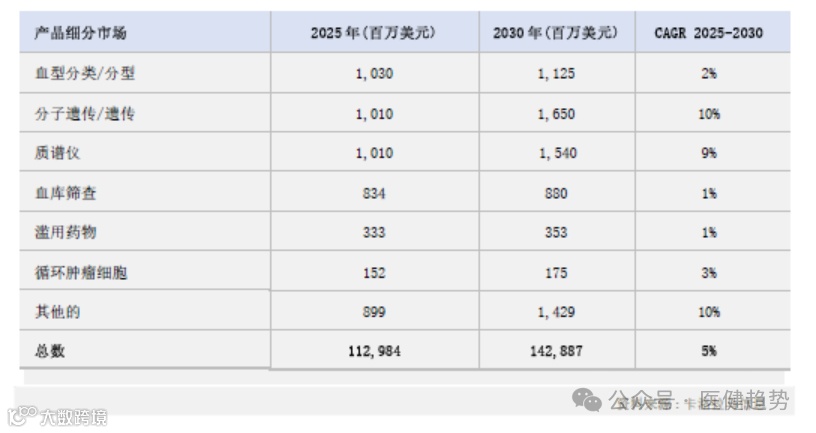 尽管整体市场稳步增长,但各细分领域表现分化。传统检测业务收入趋于平稳或小幅上升,而分子诊断、质谱、基因检测和先进现场护理(POC)系统等技术密集型领域增速预计将超过行业平均水平。