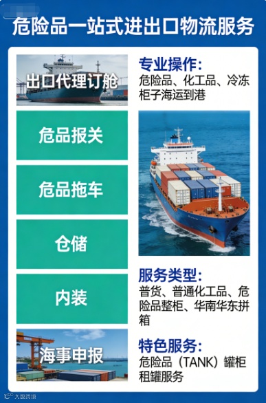 ***危险品出口代理订舱(普货/化工品/危险品Dangerous Goods订舱)、仓储、仓库内装、拖车、报关、报检、危险品海事监装、危险品海事申报等一站式出口物流服务。