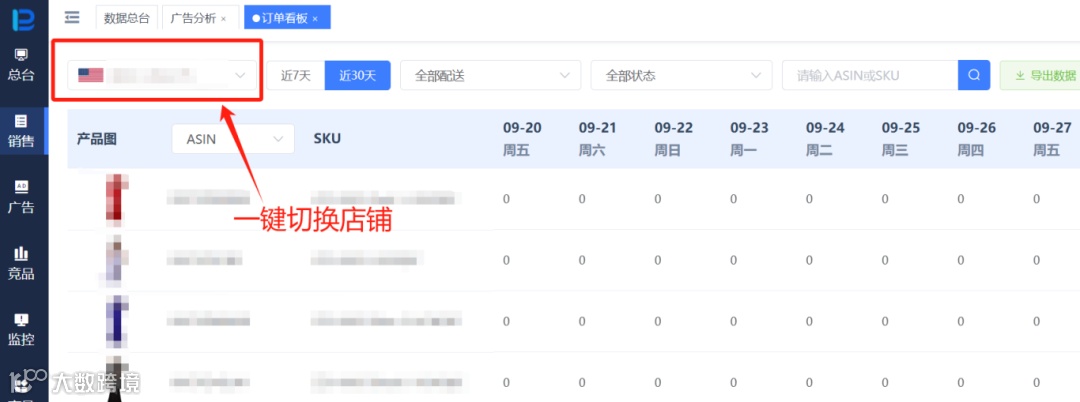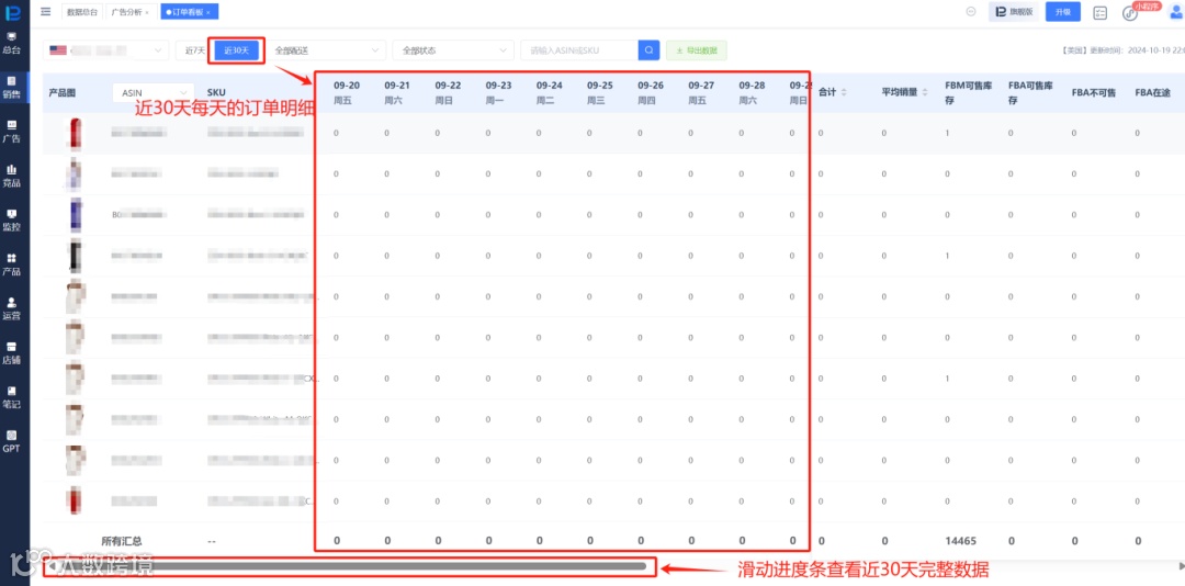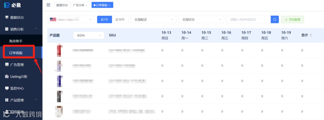 必盈订单看板,支持一键查看所有产品出单数据。通过该看板,你可以迅速了解店铺中每款产品在近7天或近30天每天的出单情况以及当前的库存状况。