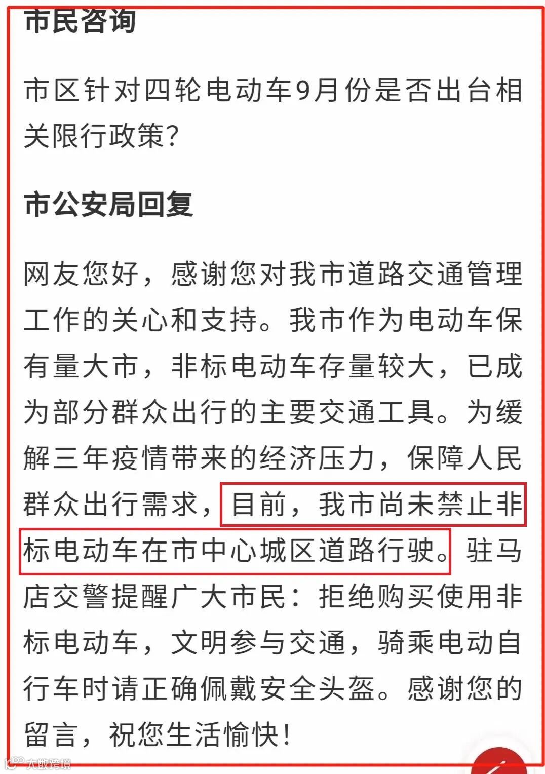 有网友通过政务平台咨询“驻马店市区针对四轮电动车9月份是否出台相关限行政策?”针对网友关心的问题,驻马店市相关部门进行了如下回复。