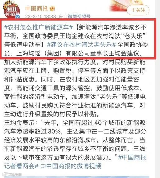 两会期间,全国政协委员、上海均瑶(集团)有限公司董事长王均金建议:加速淘汰“老头乐”等低速电动车,引发行业的一片恐慌!