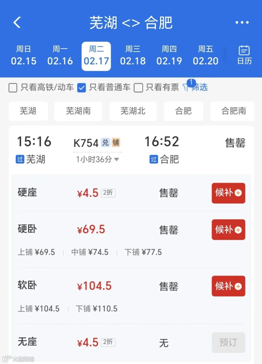 2月17日及此后数天,芜湖至合肥的K754次列车硬座票打2折,票价低至4.5元,但目前均显示已售罄;