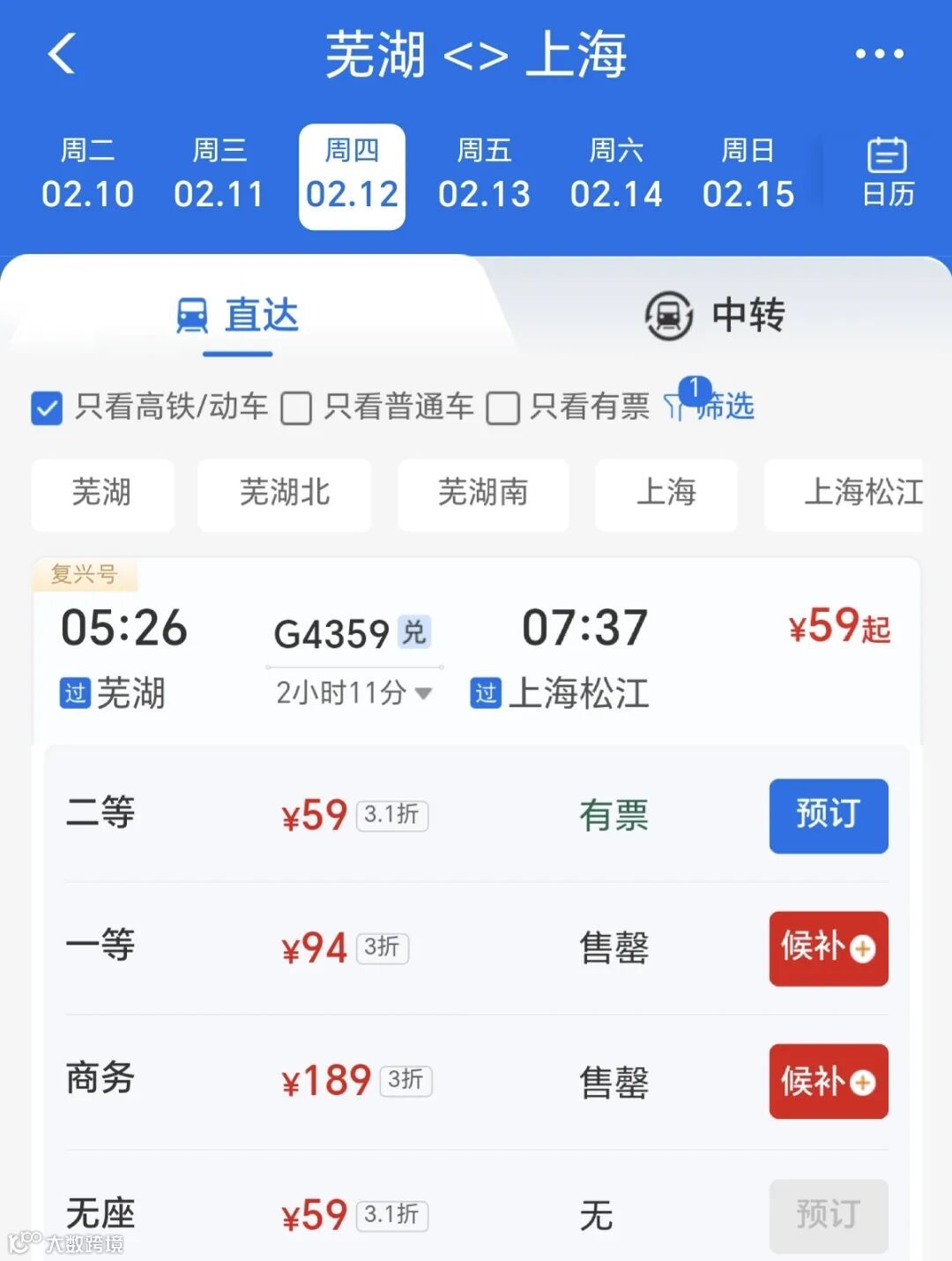 此外,2月12日,芜湖至上海南的G4359次列车最大折扣低至3折;