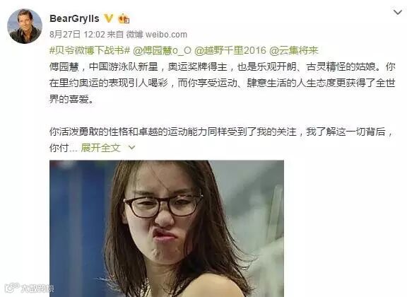 再说本届奥运会上一炮而红的“洪荒少女”傅园慧,8月27日,英国探险家、野外求生专家贝尔格里尔斯,向傅园慧发起战书,“我和干超导演邀请你越野千里,你愿意用你的洪荒之力接受我的挑战吗”。贝尔说的是东方卫视卫视的一档户外生存挑战类节目《越野千里》,傅园慧则在微博上回复“哇哇!!!!酷!哎!”。不久后,消息得到确认,傅园慧将与李彦宏等人登上这档节目。曾在采访中信誓旦旦地表示“不上综艺”的她,似乎要食言了。
