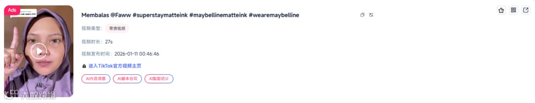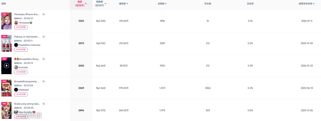 其中,带货表现最突出的,是粉丝量仅7798的中小达人 “heraaaaaa02”。她通过一条回复网友提问的 27秒投流短视频进行种草,该视频获得了160万次播放、2136次点赞 和51条评论,最终带动MAYBELLINE超持久哑光唇釉销量3203件,实现销售额Rp3.24亿(约合人民币13.37万元)。