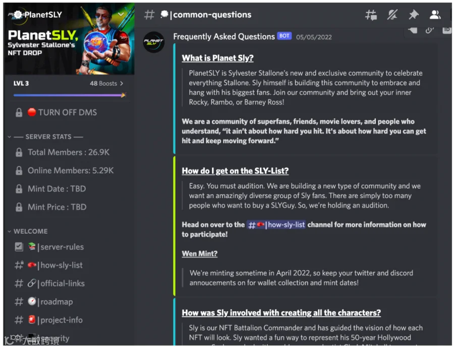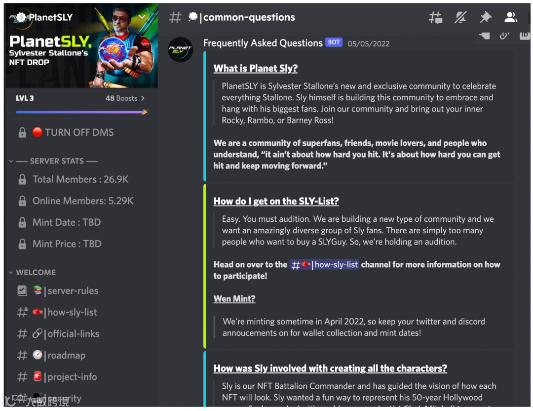 例如: 史泰龙的 PlanetSLY 项目在 Discord 的听众中有超过 26,000名成员,其营销团队在社群中发售了 9,997个 NFT, 其中三人将有机会获得与史泰龙亲身接触的机会。通过社群里的激励营销,其 NFT 出售相当火热。