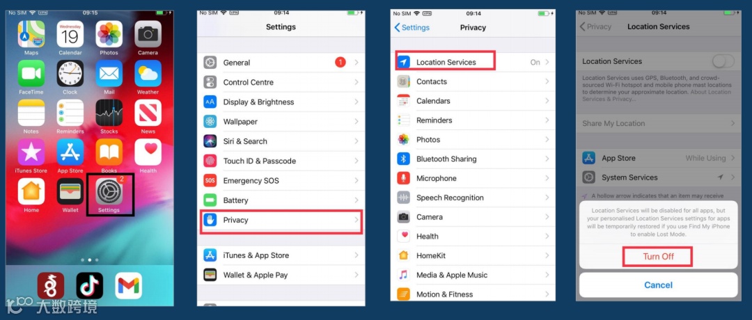设置(settings)>隐私(Privacy)>定位服务(Location Services)>关闭(Turn Off)