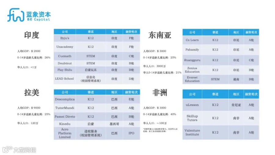 除了创新工场、GGV,顺为这类主流基金,好未来、新东方这类产业基金或战略基金也在看印度、看东南亚,甚至看美国的教育市场。