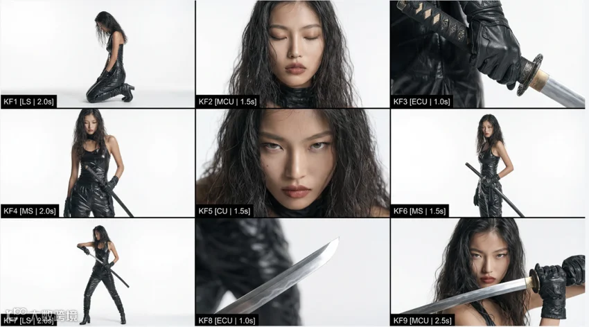 【@图片1】根据图片九宫格,让女子表演一套刀法,倚天屠龙记里的武侠感觉。超强的动作张力,极具视觉冲击,保留高速度打斗的爆发力与震撼感视觉冲击。自由运镜,合理的安排动作,高速镜头衔接。强化打击感,多角度镜头,超炫酷的特效。