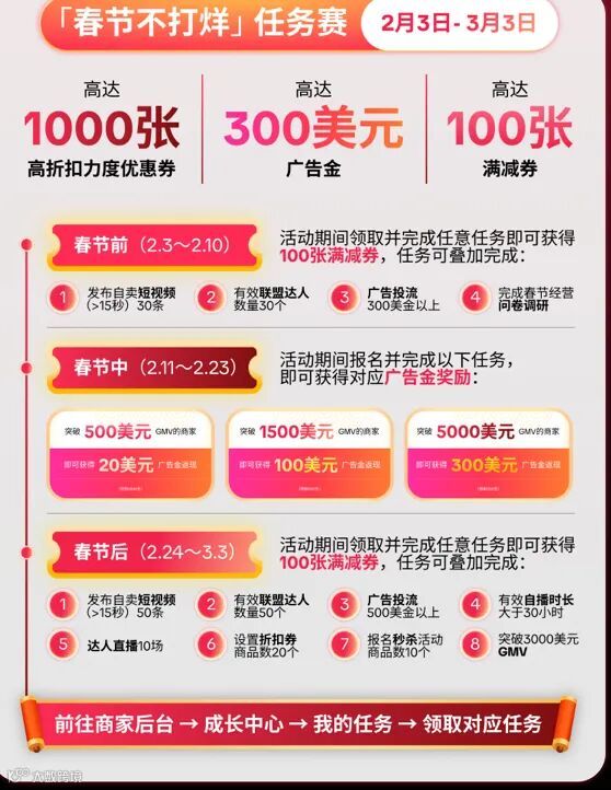 从全域政策来看,扶持力度覆盖全站点,核心以20万美金券补为核心,推出商城券(至高15%)、算法券(至高8%)、LSP券(至高5%),可叠加卖家自身优惠。结合2026年平台“高质量增长、可持续生态”两大战略,3.3大促同步推出“亿级领跑团”计划,对提报最低价、参与官方活动的卖家给予额外曝光,升级直播与精细化运营支持;同时“春节不打烊”计划,助力商家提前备货攒素材,实现旺季不断档。 -