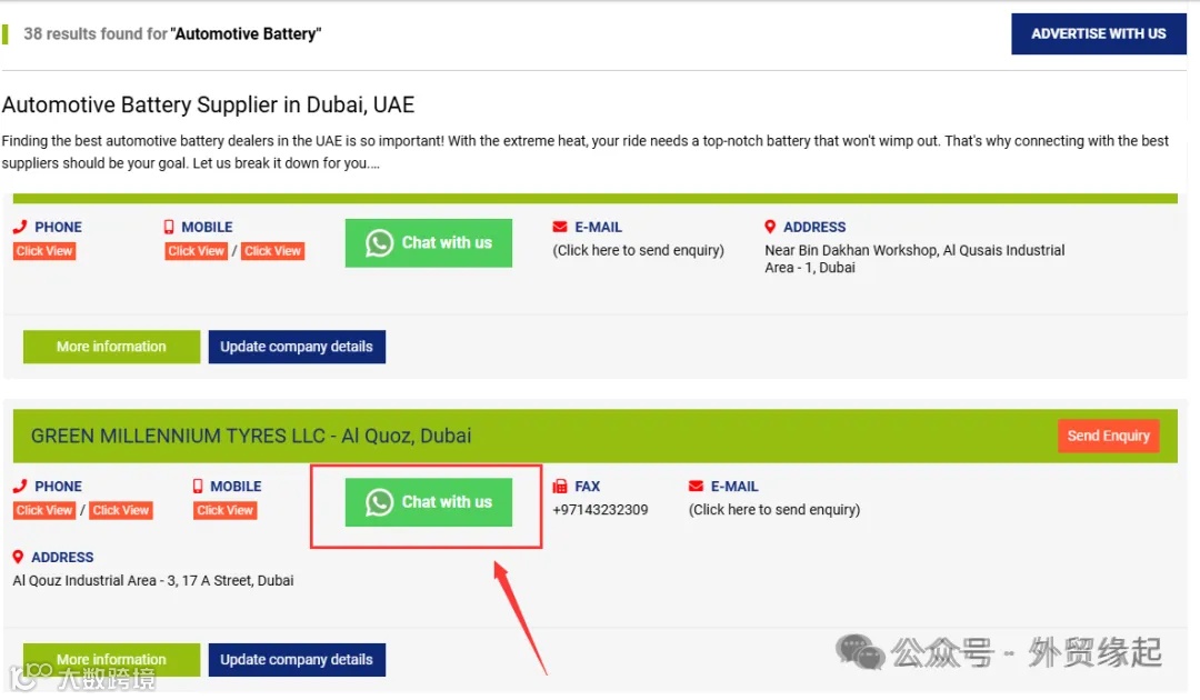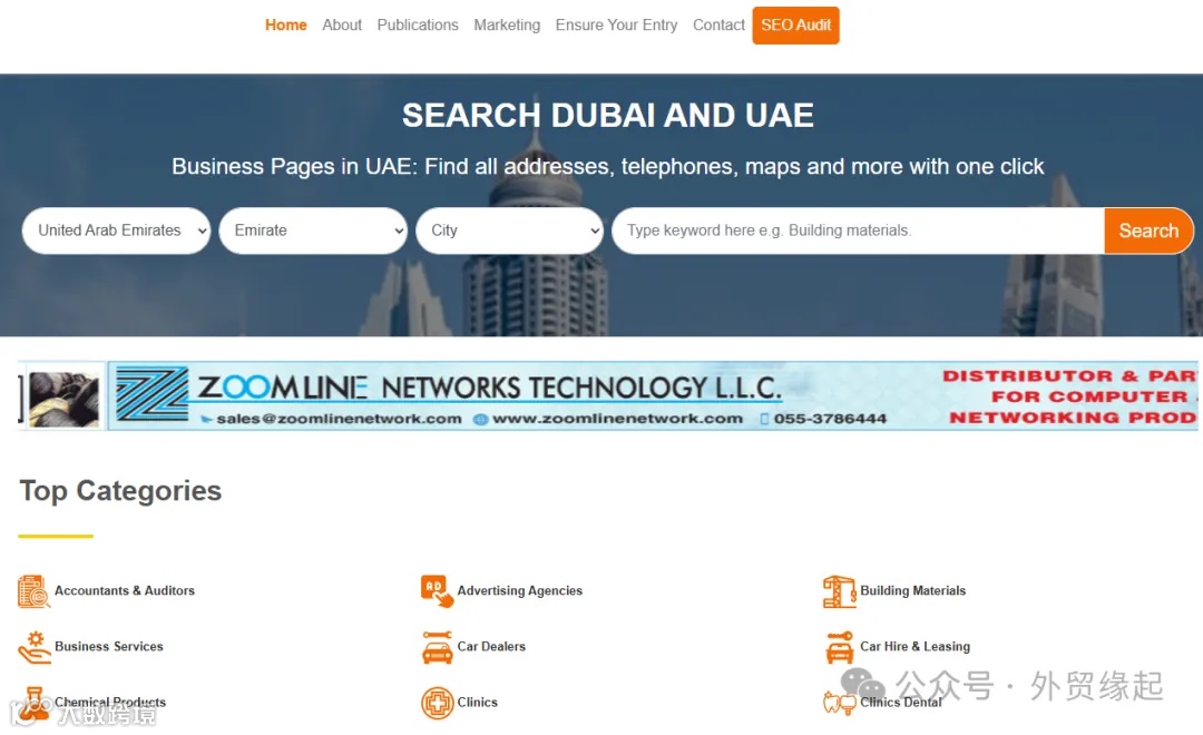 这是阿联酋的一个非常受欢迎的黄页网站,收录了阿联酋10万+的本土企业,覆盖了各行各业,可以直接看到客户的很多联系方式,比如公司名字、网站、介绍以及电话号码,最重要的是是很多公司直接公布了WhatsApp,可以直接进行在线沟通,用来开发阿联酋和中东的客户是非常不错的。
