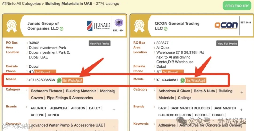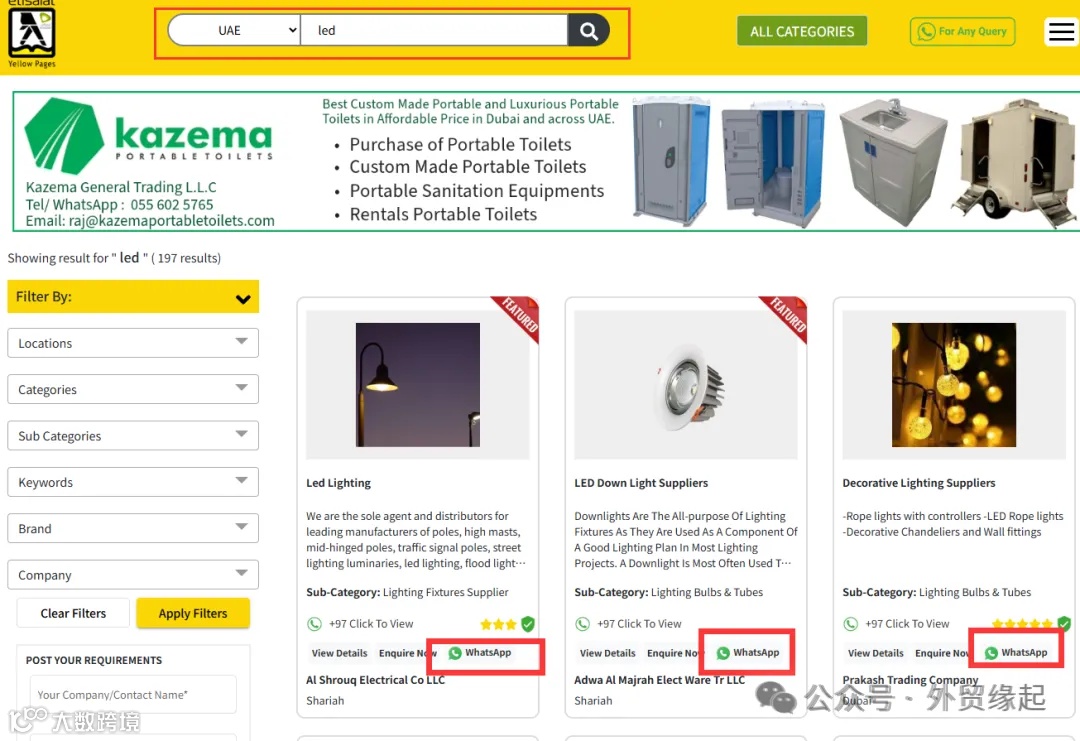 这是阿联酋的一个有名商业名录平台,搜索也非常的方便,支持按地区和按品牌/产品类别进行搜索。搜索出来的信息也很多,公司名字、电话,然后也可以用WhatsApp进行沟通,非常的不错。