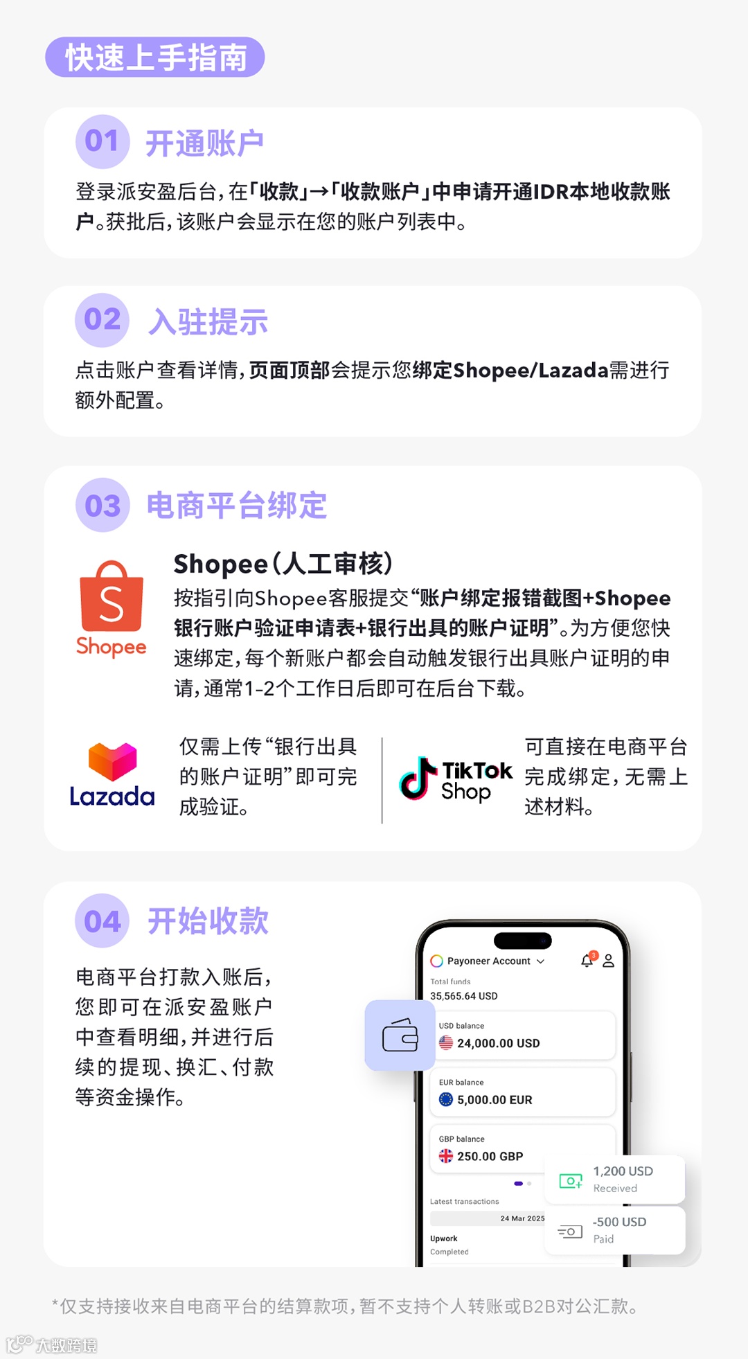 即日起,派安盈正式推出印尼卢比(IDR)本地收款账户,实现从0到1的关键突破,全面打通Shopee、Lazada、TikTok Shop、Blibli等主流平台的印尼收款链路。
