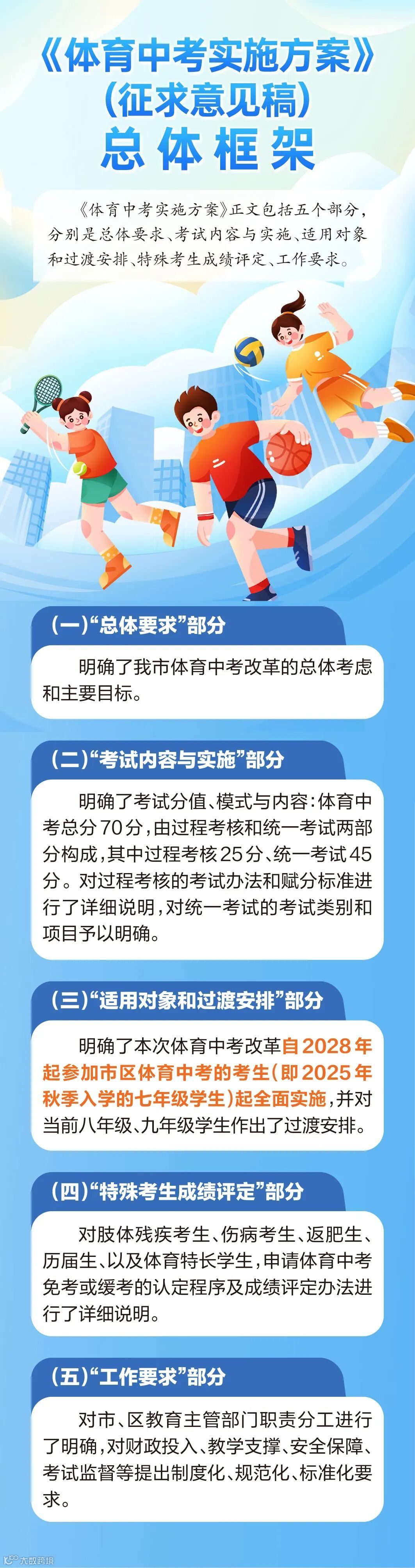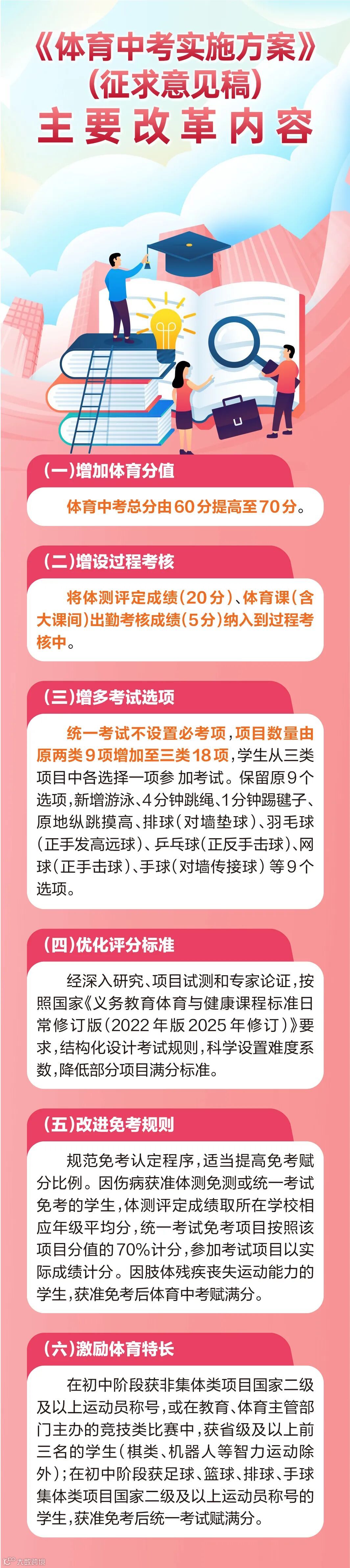 对于过渡时期学生(即2026年、2027年参加中考的学生),不参加过程考核,仅参加统一考试,满分仍为60分,在第一类项目中“3选1”,在第二类和第三类项目中“15选2”,每项20分,各项目使用新评分标准。特殊考生成绩评定按新方案执行。这种兼顾新老考生的渐进方式,让改革惠及更多考生,回应了社会和家长对中考体育改革的期待。