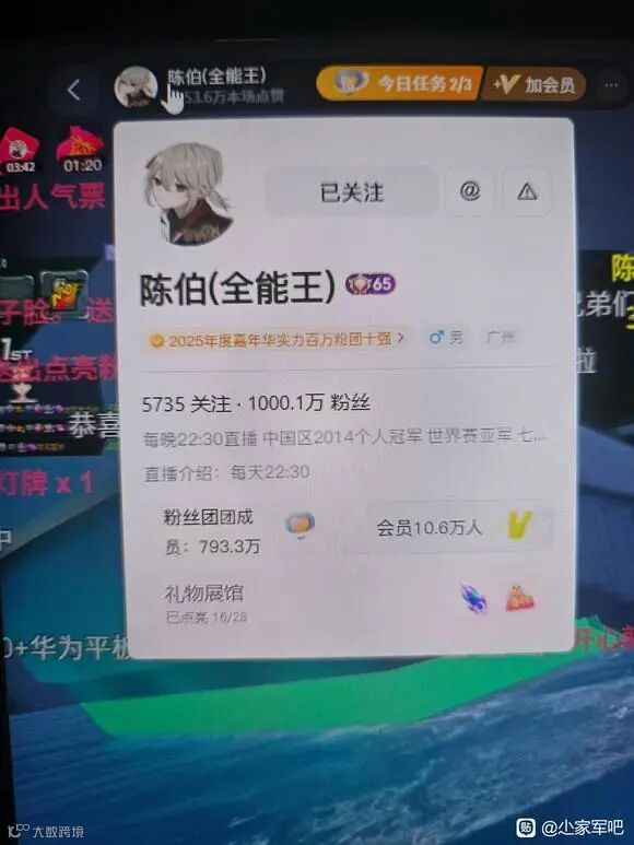陈伯近期人气持续走高,粉丝增长势头迅猛,目前粉丝量已突破一千万大关,成为游戏界名副其实的“流量大手子”。