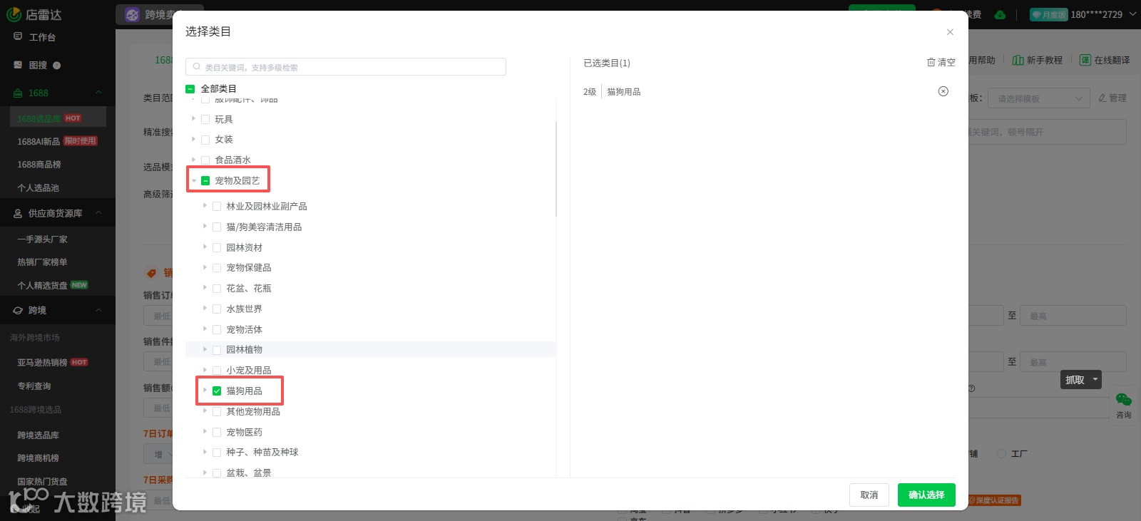 首先,我们打开店雷达选品工具,进入1688选品库,明确目标类目,可到三级细分类目(以“宠物用品”为例,进一步细分为“猫狗用品”)。