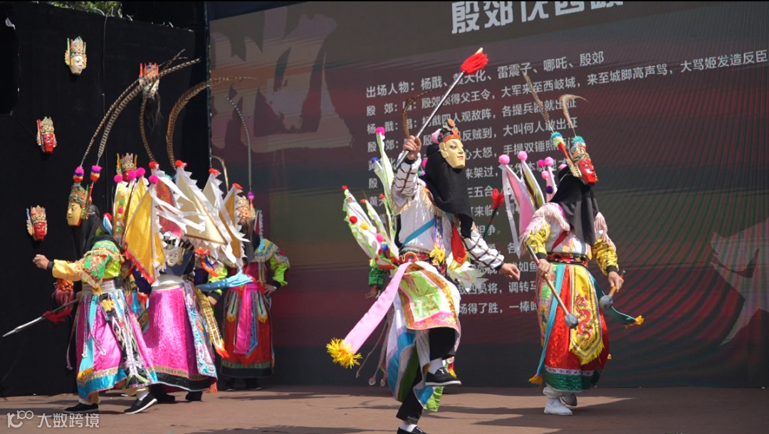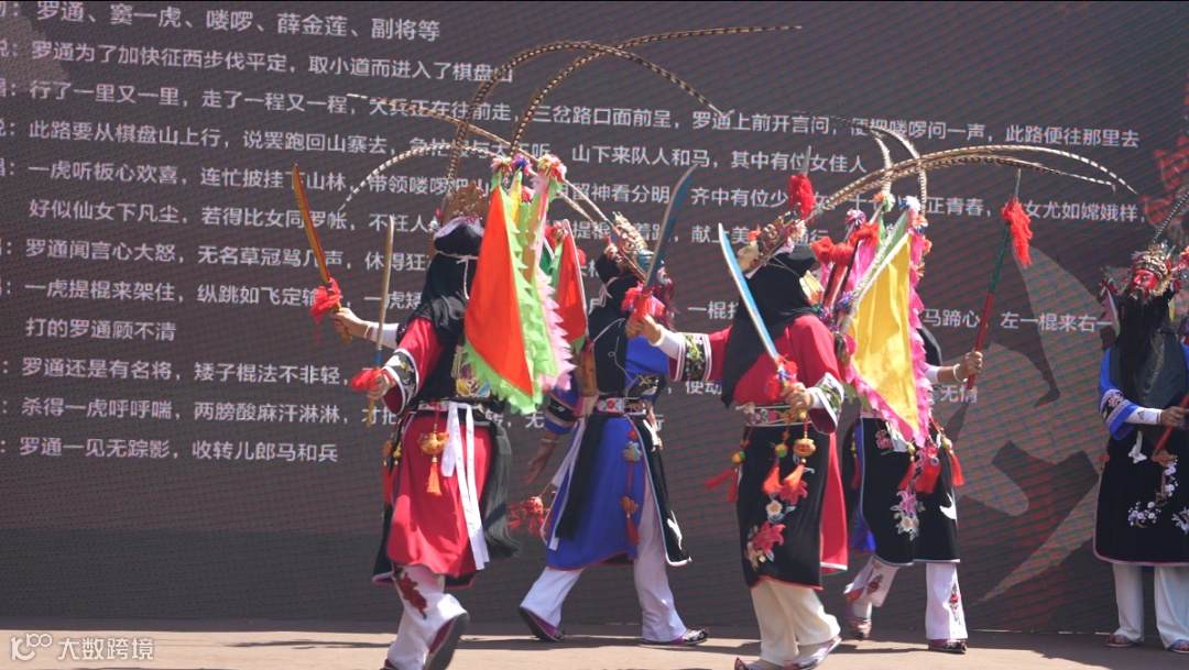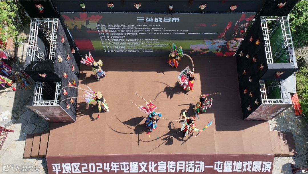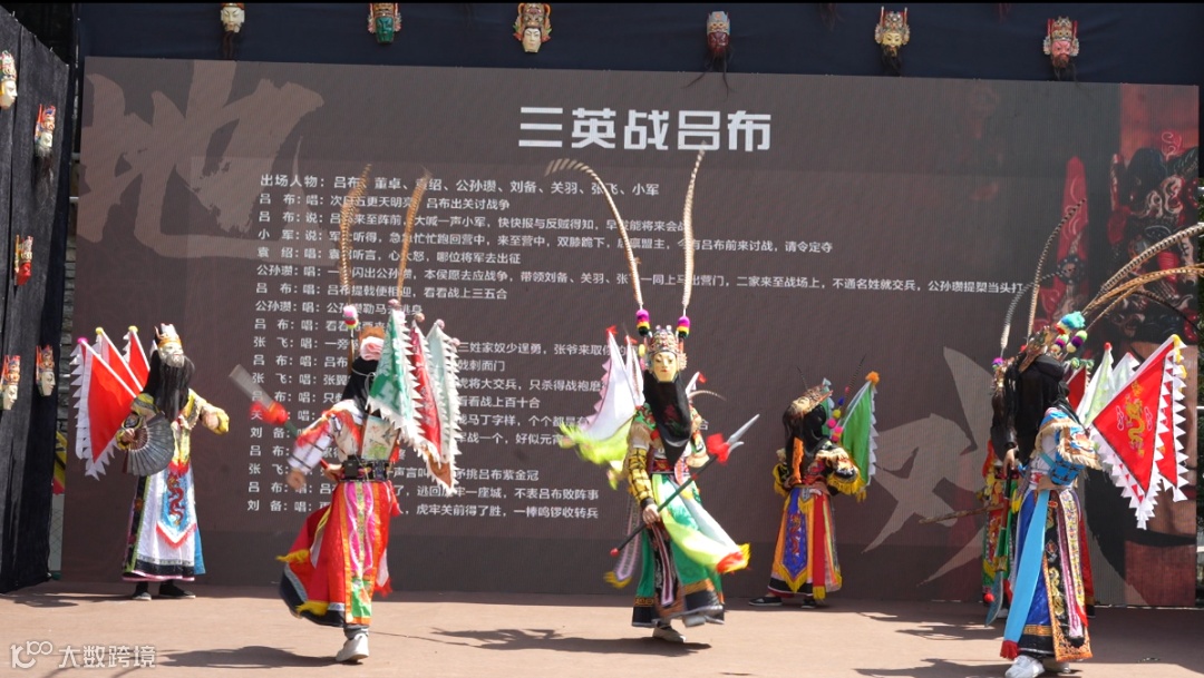 随着一阵阵锣鼓声响起,一台名为《三英战吕布》的地戏在天龙屯堡古镇的“老学堂前广场”粉墨登场。他们头顶面具,面罩青纱,背插小旗,手持刀、枪等兵器,在铿锵的锣鼓伴奏中相互唱、和、舞、打。