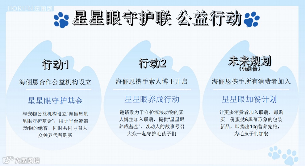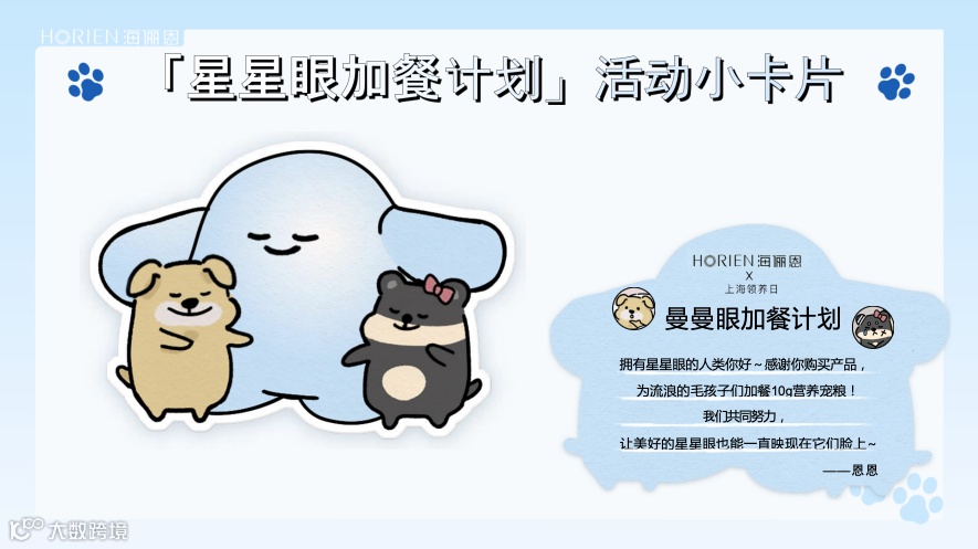 4)线上线下联动,放大公益能量。除线上持续发力外,9月即将下沉到线下,将会以两只被收编的狗狗名义,联合宠物救助机构,建立救助基金、“加餐计划”,并同步流浪主题大片,惊喜释出,一起助力公益活动。其中“加餐计划”是海俪恩将上新流浪狗IP包装新品,消费者每购买一份带狗狗IP包装产品,海俪恩就会向宠物救助机构捐献一份宠物粮。这种结合商业与公益的模式,既能展现品牌的责任担当,又能切实改善流浪狗困境,是企业向善的有效实践。