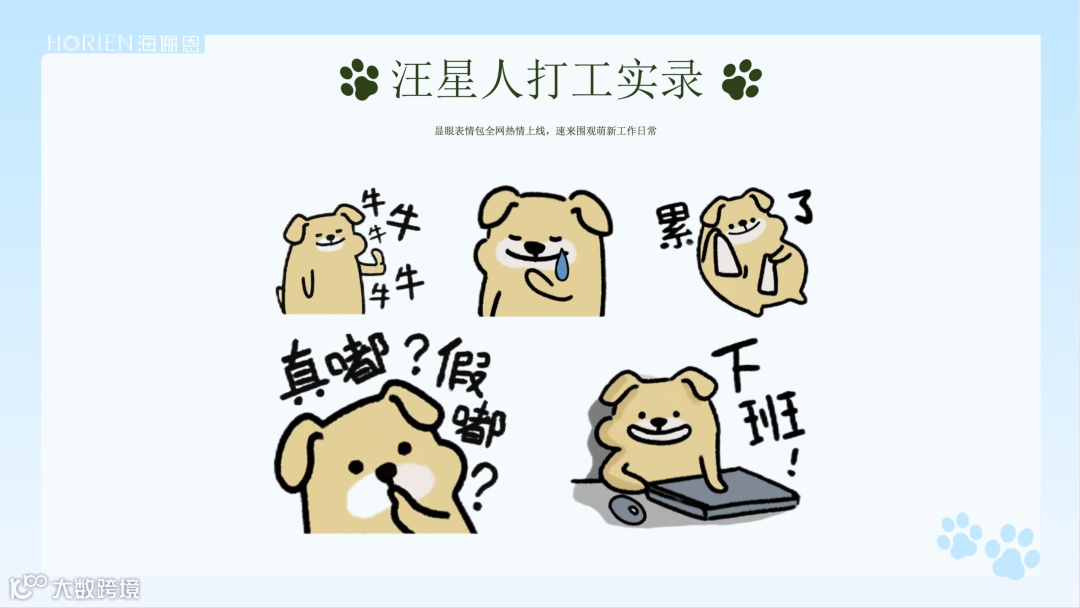 3)持续上新IP周边产品,拓展事件影响力。“累了”、“真嘟?假嘟?”等代表当下年轻人真实情绪状态和热点话题。海俪恩以流浪狗为原型设计的系列表情包一上线既收获广泛好评,以表情包为内容载体,海俪恩更快与年轻用户打成一片,提高他们与品牌的互动频率和深度。