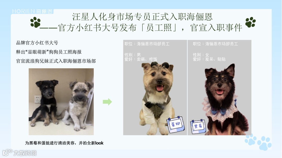 海俪恩在小红书上开辟新的非官方账号,以“狗狗第一人称视角打工全记录”为主持续更新趣味内容动态,流浪狗也成打工人,新鲜且富有活力的内容极具代入感的内容满足用户好奇,轻松吸引爱“云养宠”的年轻受众。