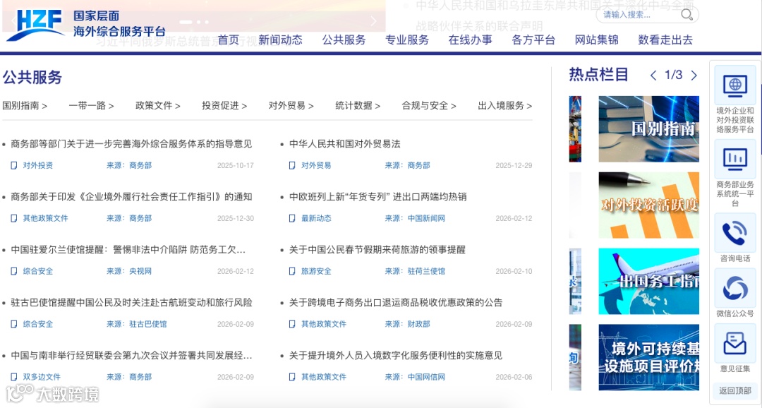 2月11日,国家层面海外综合服务平台正式上线运行,该平台统筹了法律、财税、金融、外事、经贸、物流、海关、贸促等众多领域服务资源,为企业“走出去”提供便捷资讯信息服务查询办理。