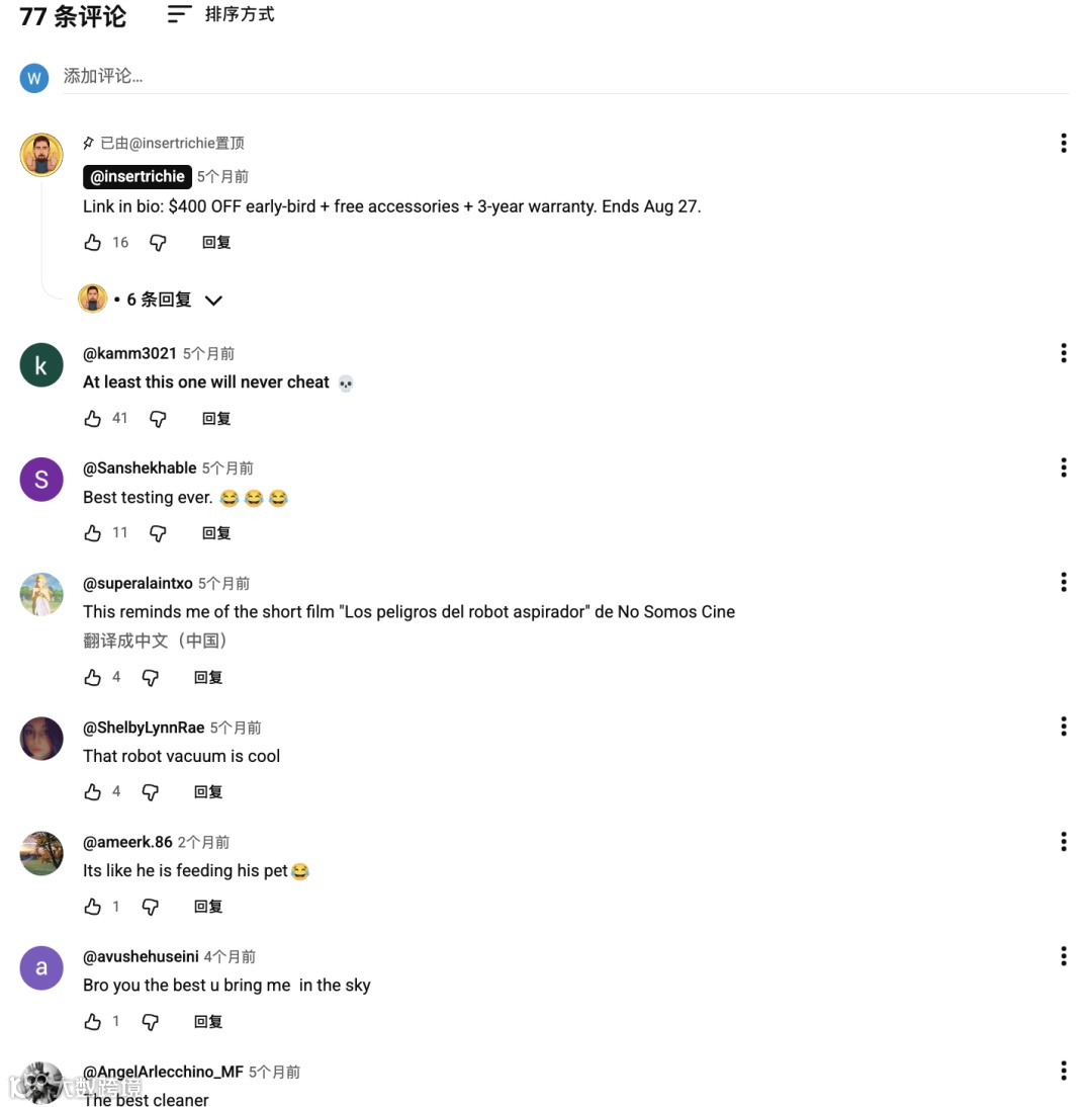 该视频获得约57万次播放、1.1万次点赞及77条高质量互动评论,用户高频留言如“That robot vacuum is cool”“Best testing ever”,并大量关注优惠力度与保修政策,购买意向明确,转化路径短而高效。