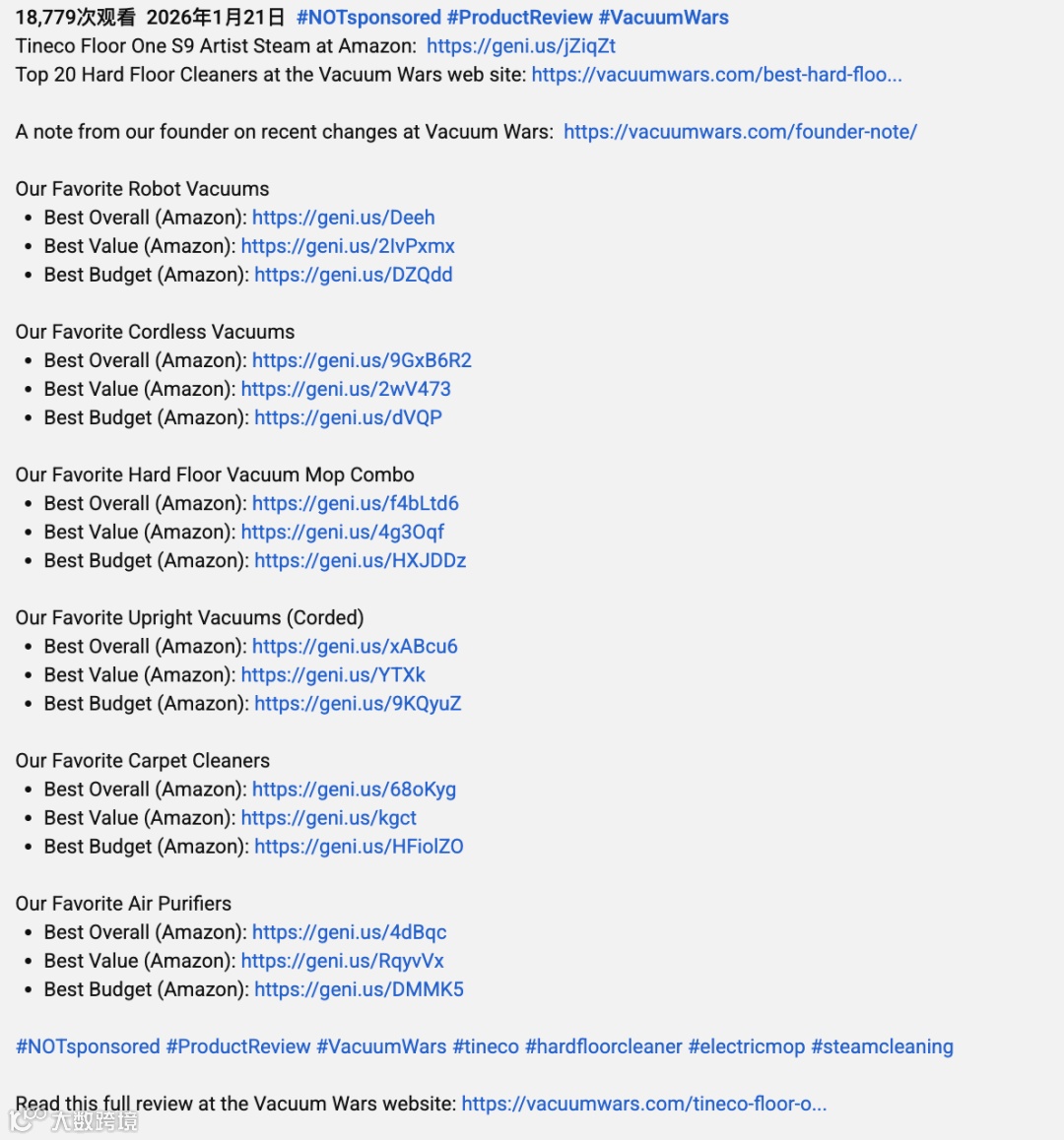 其与Tineco的合作摒弃硬广逻辑,将Tineco洗地机自然融入日常评测流程——从开箱、功能演示、地板/沙发底等真实场景清洁,到长期使用追踪,全程保持原生内容调性。视频明确标注合作属性,同时在描述区与置顶评论附Amazon购买链接,实现种草与转化无缝衔接。