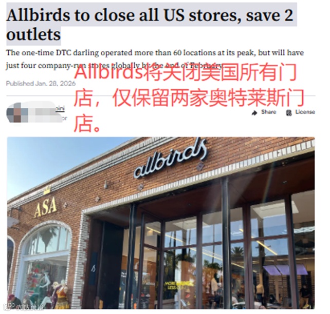美国DTC鞋类标杆品牌Allbirds宣布:将于2026年2月底前关闭其在美国市场的所有正价门店,全面收缩线下业务,将资源集中回电商、批发及国际分销渠道。
