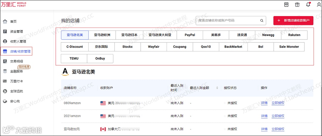 这里会列出你已开通的所有收款账户(比如亚马逊、Shopee、TikTok Shop 等等)。