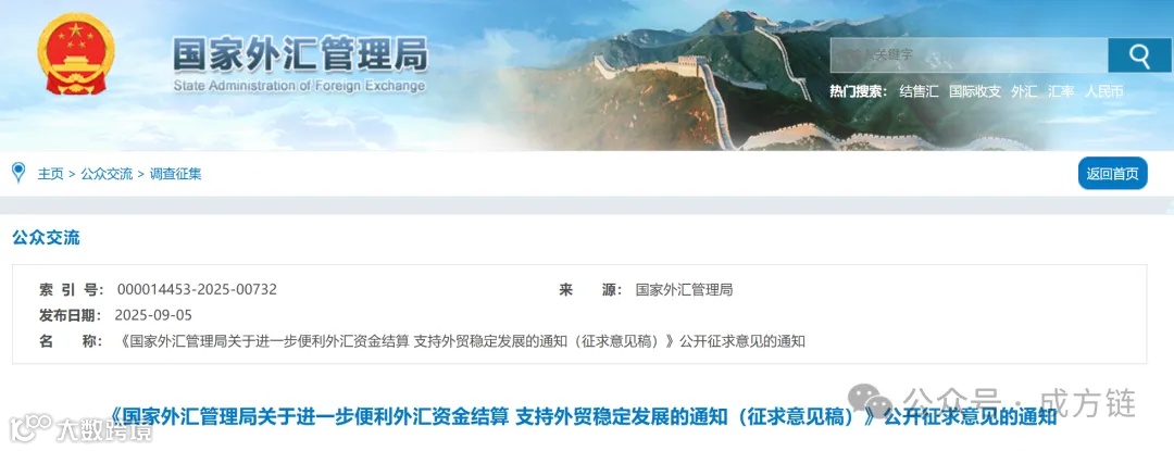 9月5日,国家外汇管理局起草了《国家外汇管理局关于进一步便利外汇资金结算支持外贸稳定发展的通知(征求意见稿)》,向社会公开征求意见,截止时间为2025年10月5日。