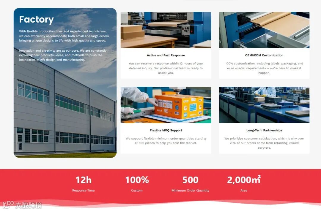 采用数字化表达强化可信度,例如:“20年行业经验 + 20万㎡生产基地 + 500人团队”,比文字描述更具说服力。