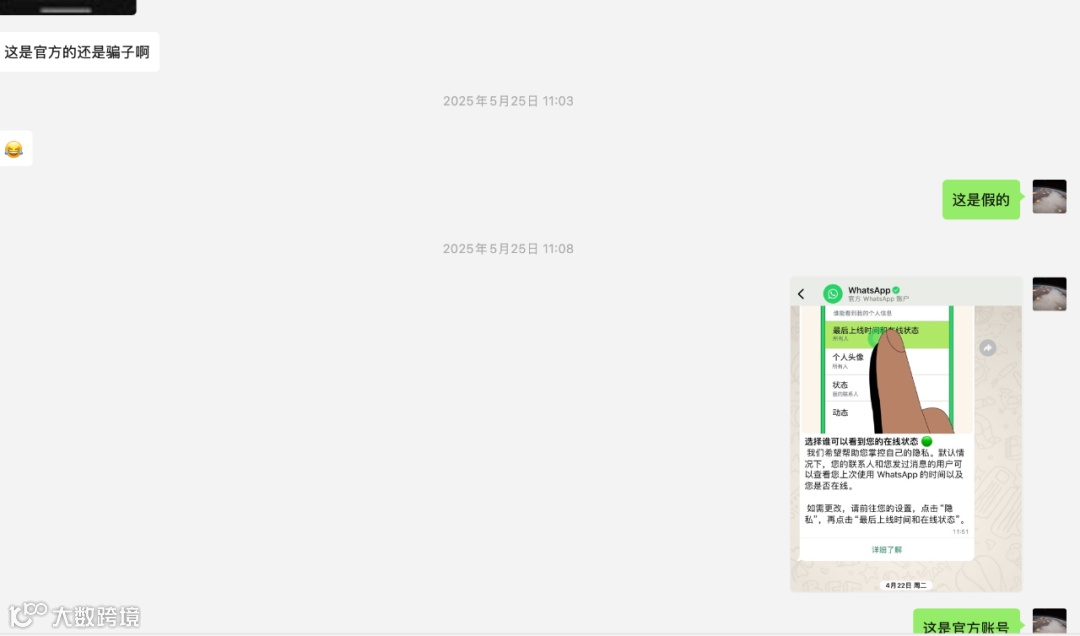 官方账号有认证符号,只有官方可以发送消息,目前能够联系whatsapp的官方渠道只有一个support邮箱,回复也算是及时。
