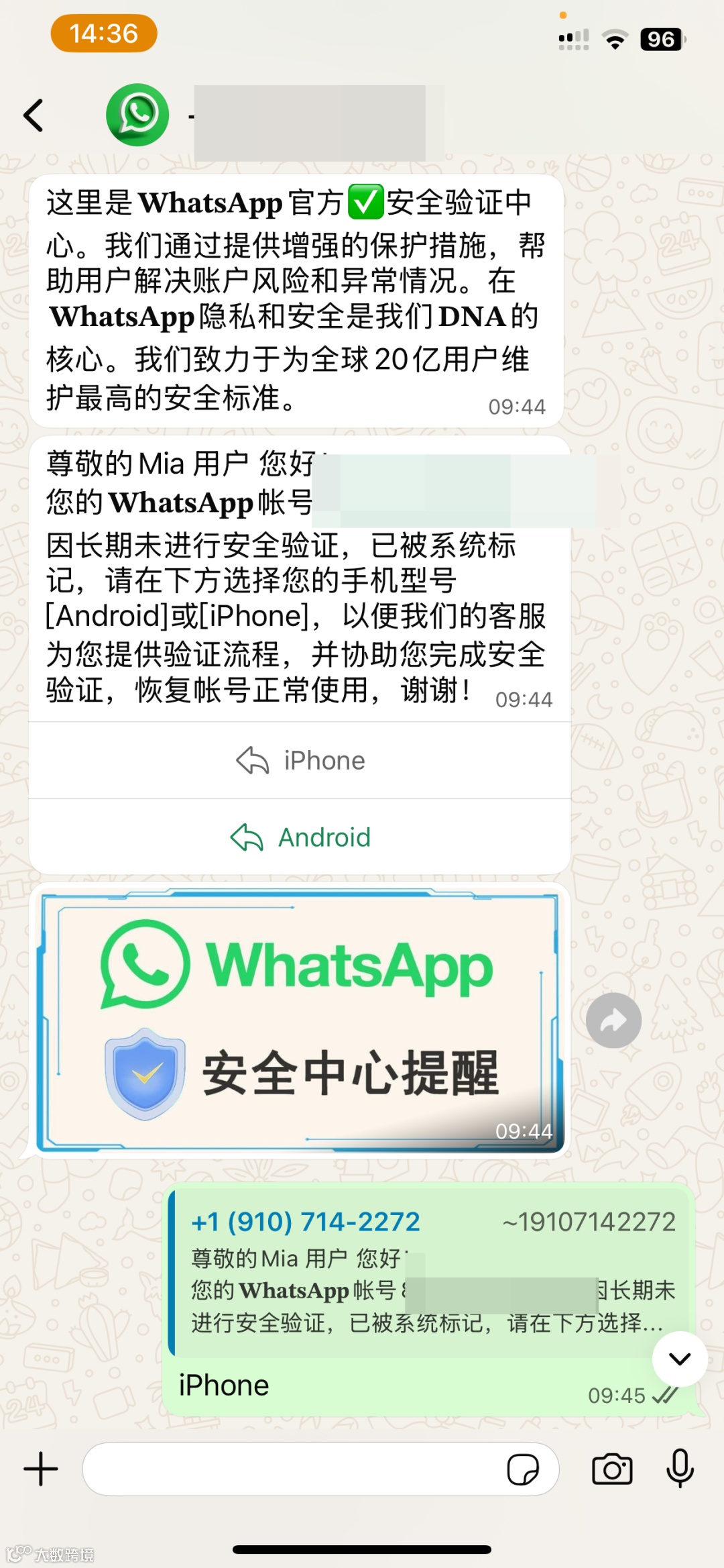 一个1开头的美国账号,号称whatsapp官方账号的人说: