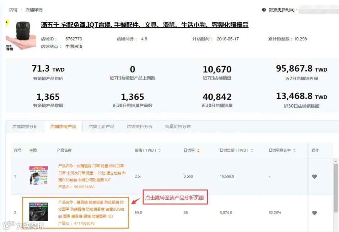 点击【标题】即可进入产品原网址链接。点击【所属店铺】可进入店铺整体数据查看页面。